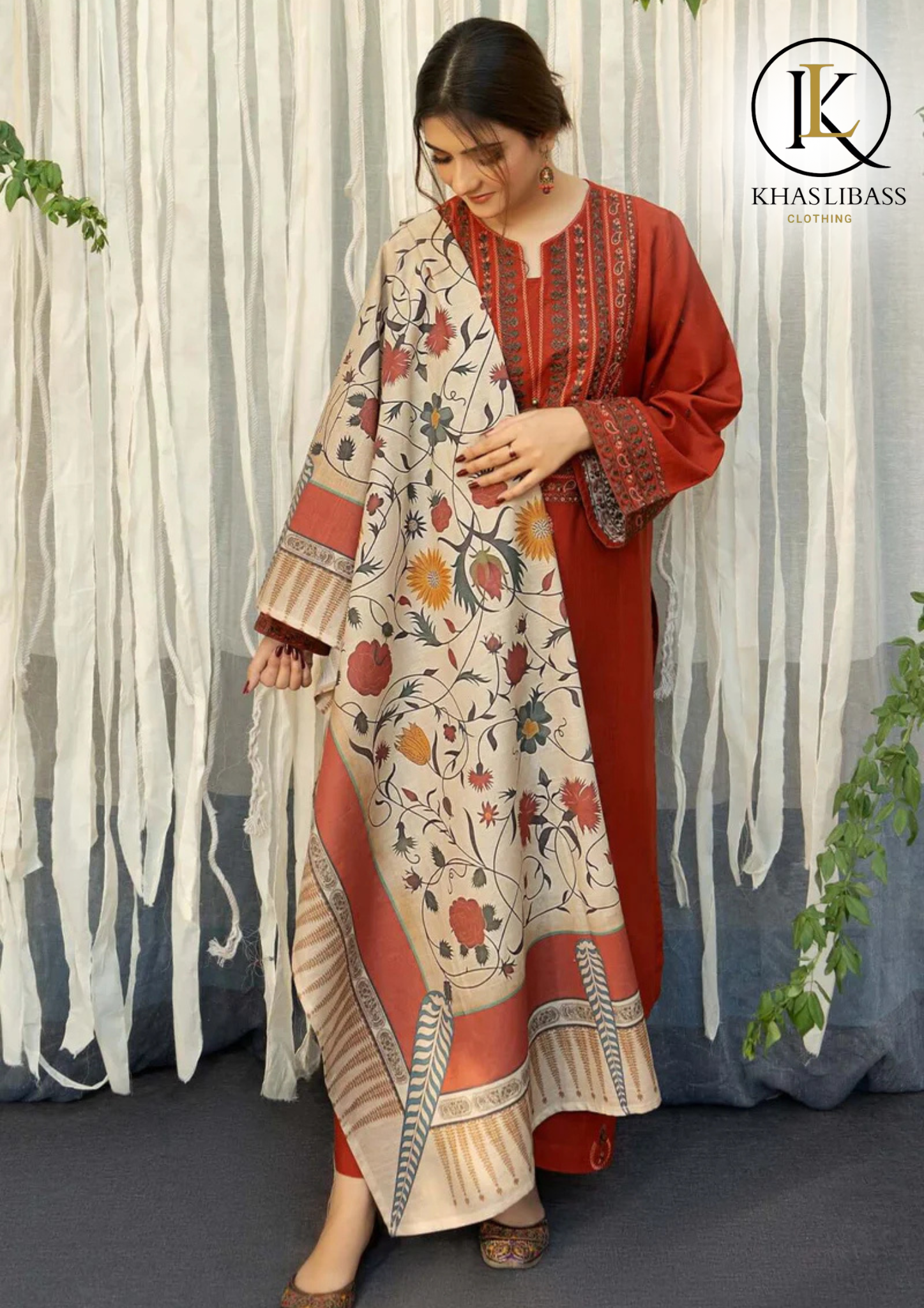 Winter Unstitched 3PCs Embroidered Dhanak Dress With Digital Printed Wool Shawl KL-369